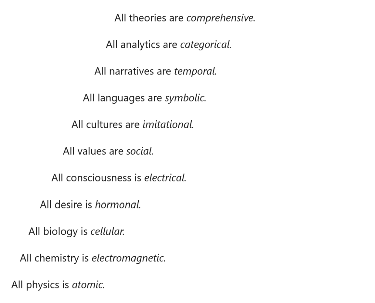 Readers of The Infinite Staircase (who are not many but whom I highly esteem) will know that it describes reality as constituted not of two but rather of eleven separate levels. At the bottom of the staircase is physics, all matter, no mind. At the top is theory, all mind, no matter. But there are nine layers in between, and here is the amazing thing. Each one is not only distinctly separable from the one above and below it, it is also defined by what I will call a characteristic attribute.